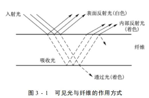 纖維可看成是半透明物體, 部分光可進入纖維內部, 在內部主要發(fā)生吸收、散射或發(fā)射熒光。吸收主要由染料和光發(fā)生互相作用, 即發(fā)生選擇吸收, 互補光被漫反射或透過纖維, 使纖維呈現(xiàn)顏色, 未被吸收的光則在纖維內部發(fā)生散射, 部分光也透射出來。